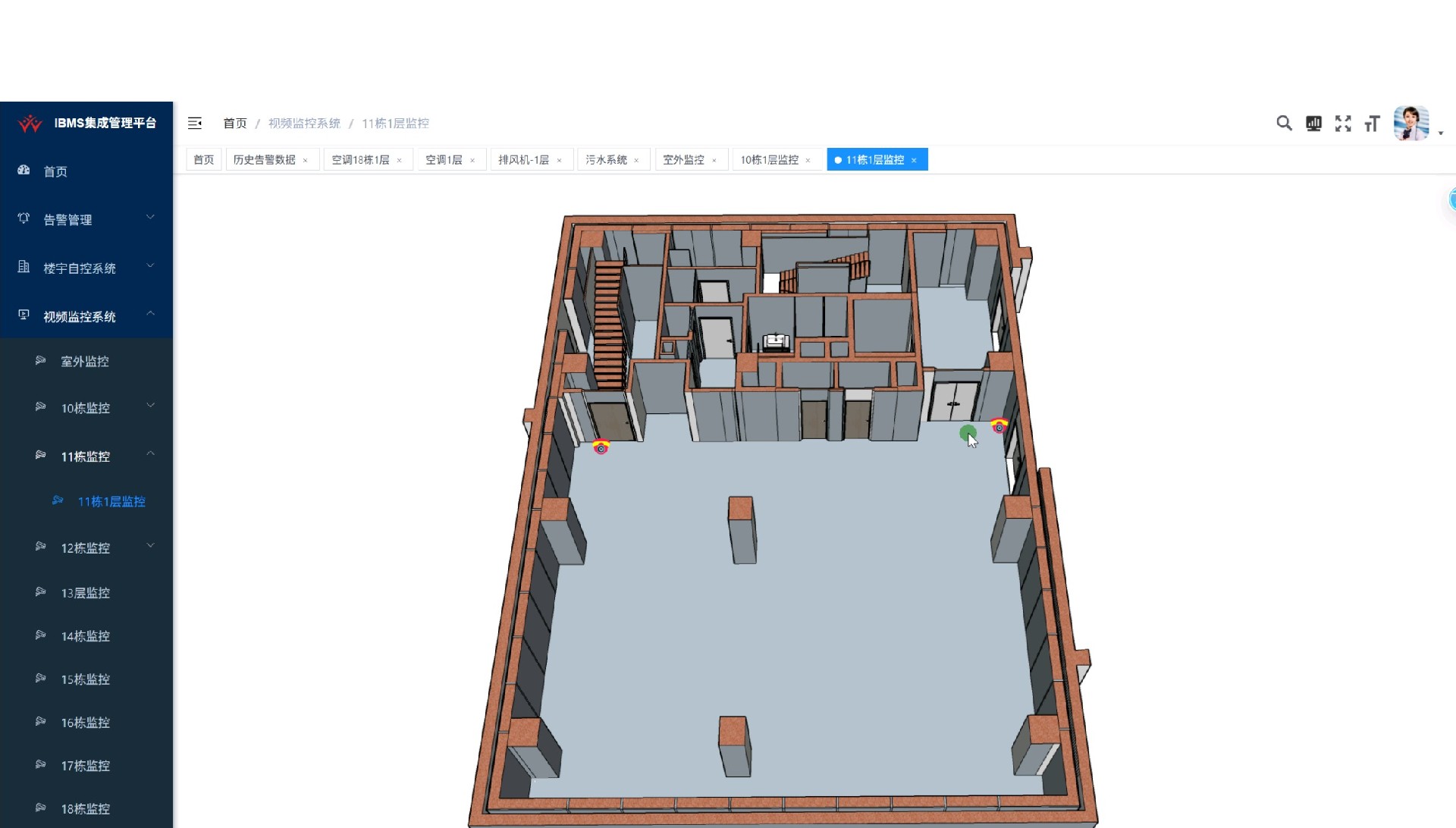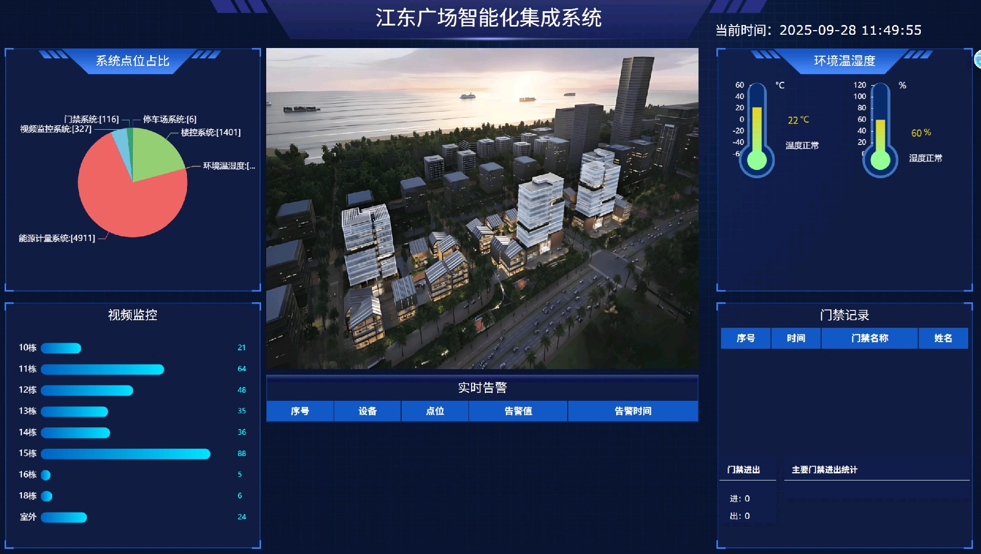 海南江东广场通过集成平台实现对建筑群各个楼栋中的监控、能耗、报警、空调等设备数据监测,当设备发生故障,主页通过醒目文字提醒值班人员处理相关事件减少不必要的损失。